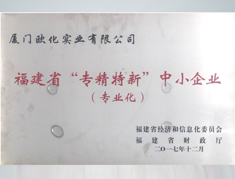 2017年12月,福建省经济和信息化委员会、福建省财政厅授予厦门欧化实业有限公司,“福建省专精特新中小企业(专业化)”荣誉。