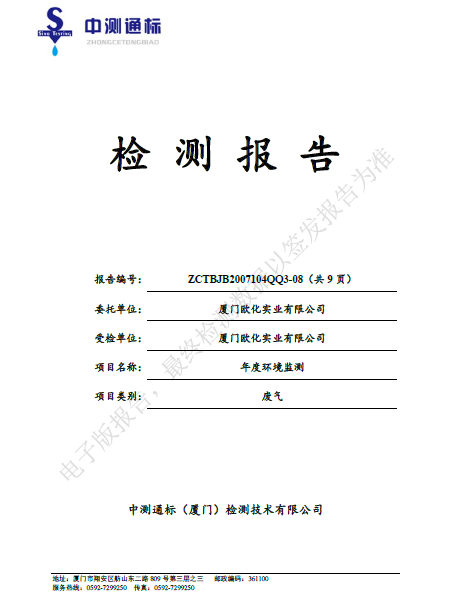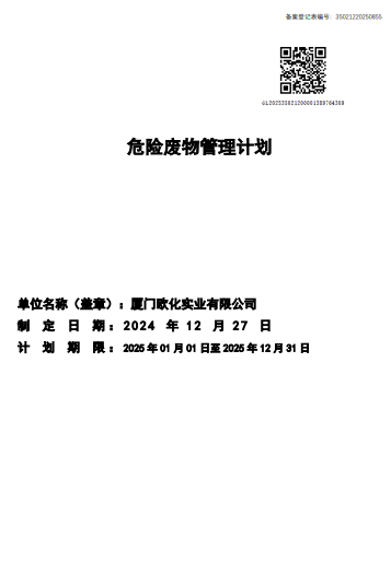 2019年4月2日我司(厦门欧化实业有限公司)签署发布了《突发环境事件应急预案》,并将相关文件及其信息上报至厦门市同安环境保护局备案。厦门市同安环境保护局于2019年4月11日受理并予以备案,备案编号:350212-2019-006-M。